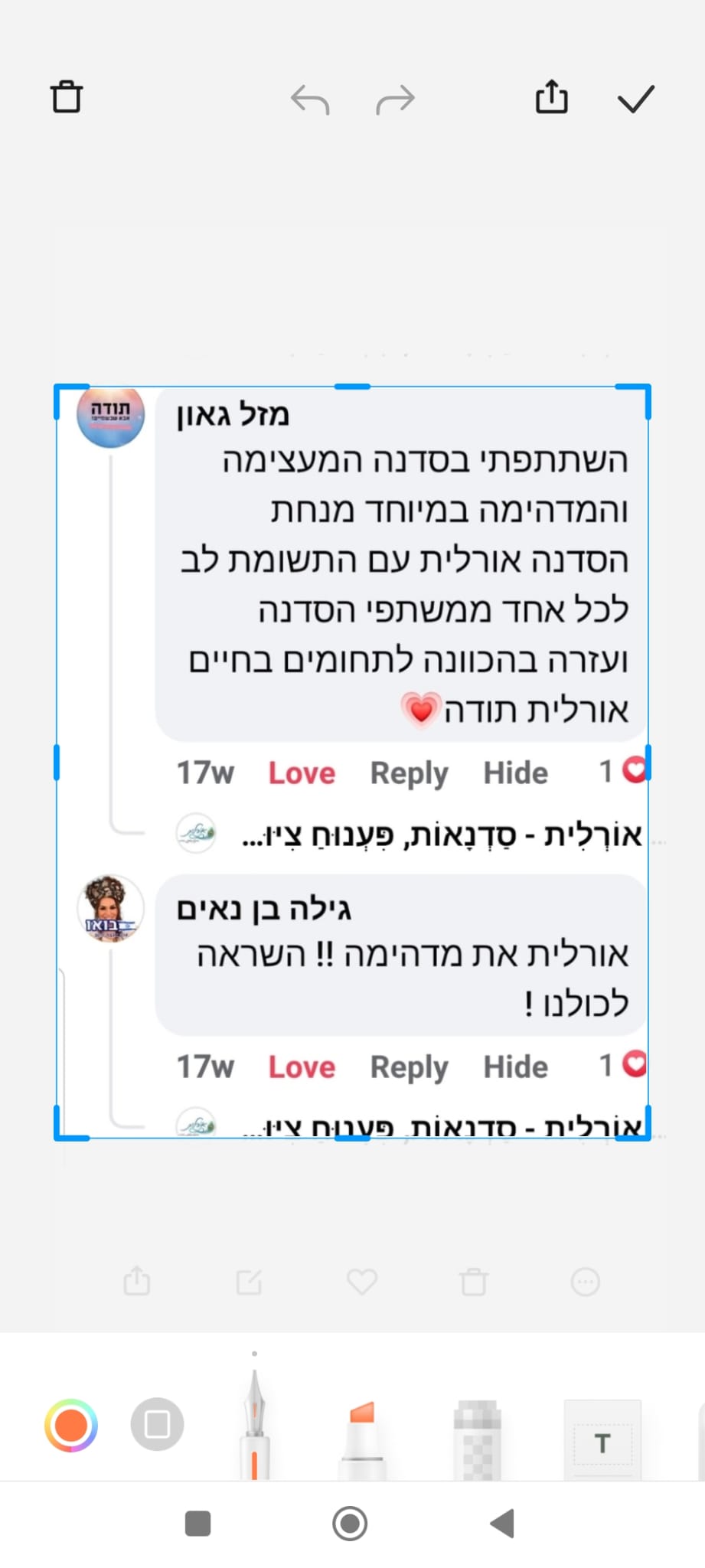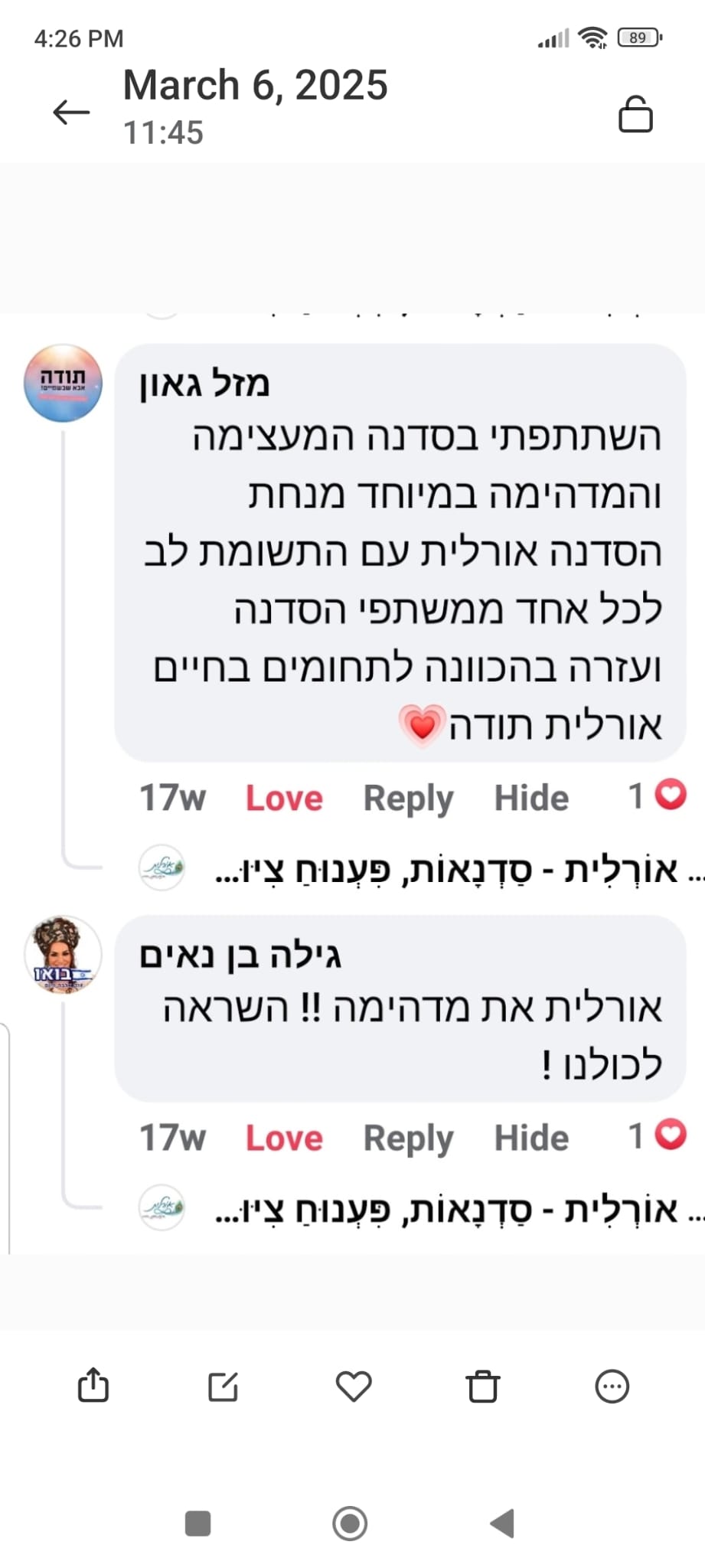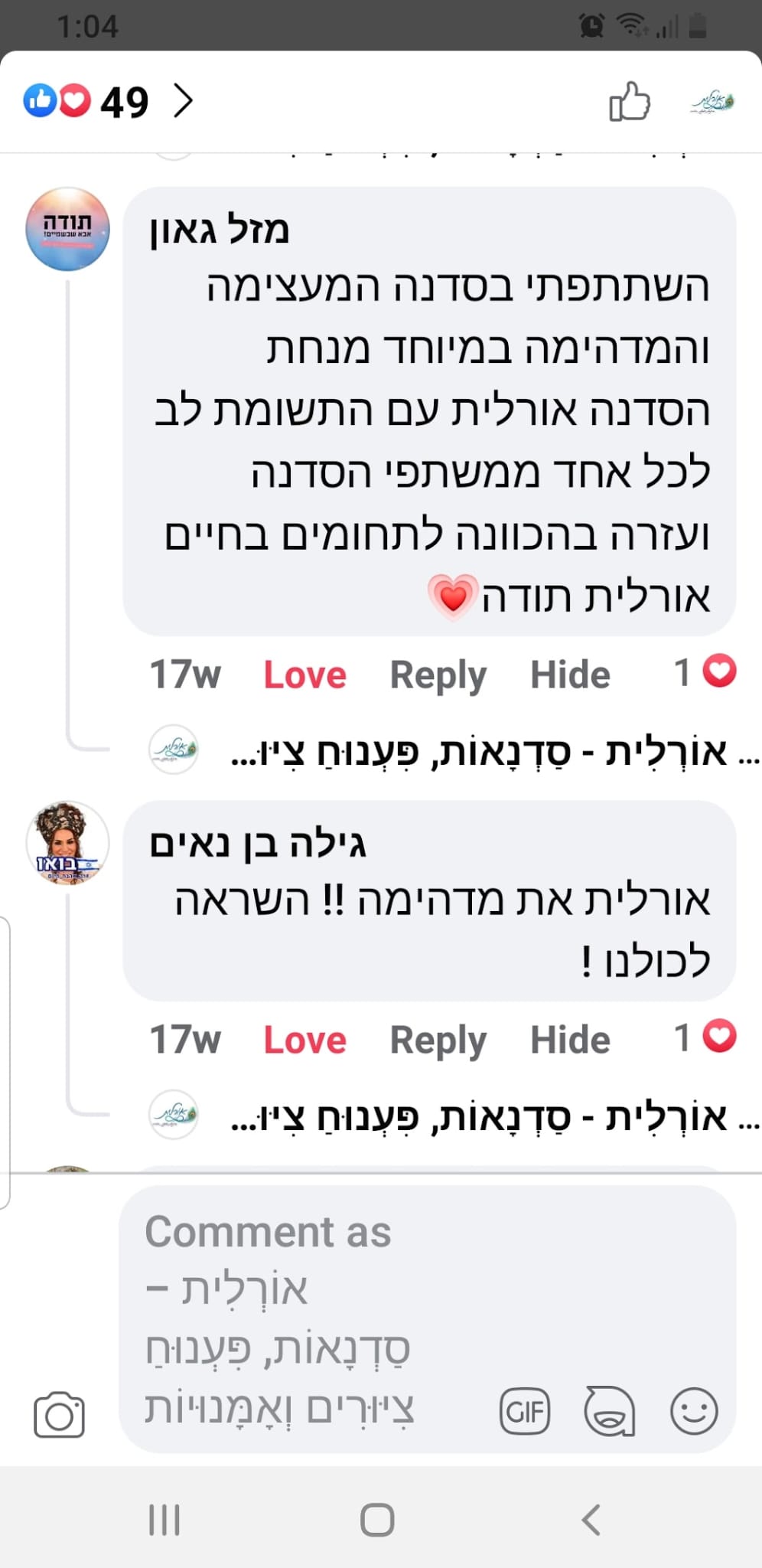 השתתפתי בסדנה המעצימה והמדהימה במיוחד מנחת הסדנה אורלית עם התשומת לב לכל אחד ממשתפי הסדנה ועזרה בהכוונה לתחומים בחיים אורלית תודה