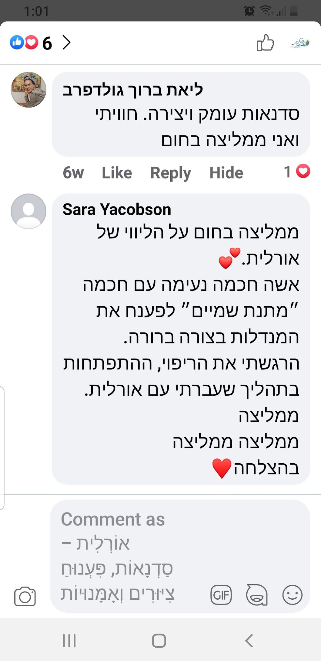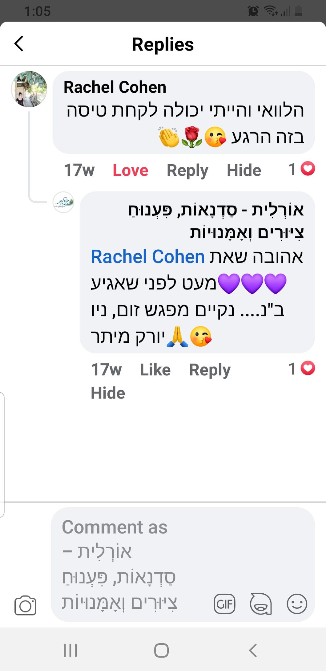 יותר מאשר שיעור אמנות, זה היה מסע של גילוי עצמי. אורלית מעבר לטכניקה - היא משלבת מחשבה יהודית, רוחניות והבנה עמוקה יותר של עצמך בכל שיעור .. אם התמזל מזלכם לחוות את השיעור הזה, אני ממליצה בחום לעשות אותו עם אורלית.