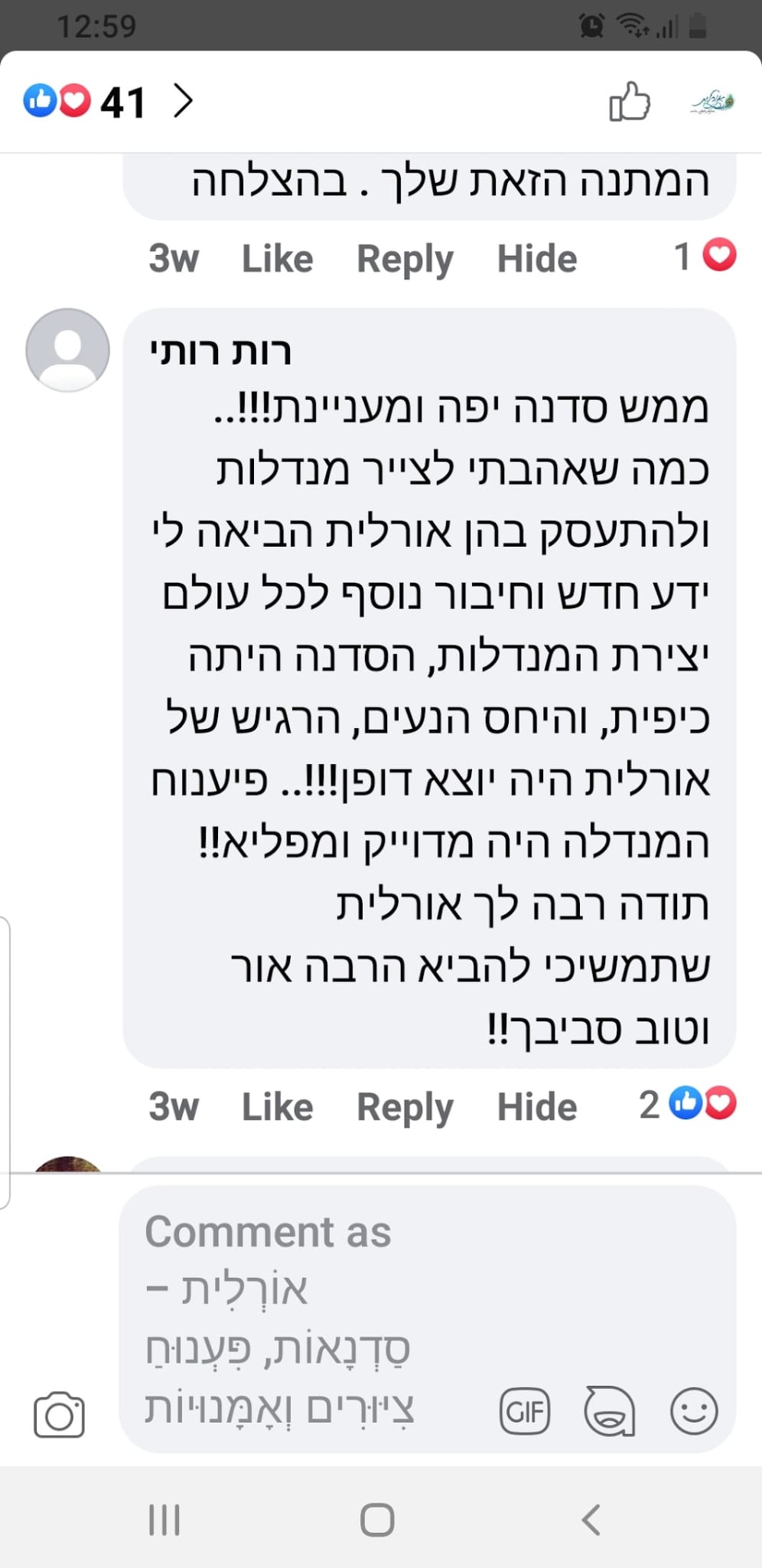 הייתה לי את החוויה הכי מדהימה בסדנת המנדלות של אורלית! אורלית יצרה אווירה כל כך מסבירת פנים ושלווה, מנחה אותנו צעד אחר צעד ובמקביל עודדה יצירתיות וביטוי עצמי .. ממליצה בחום!