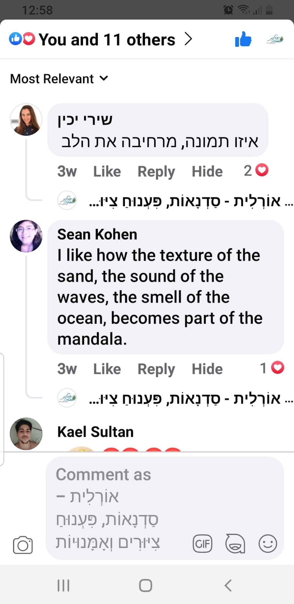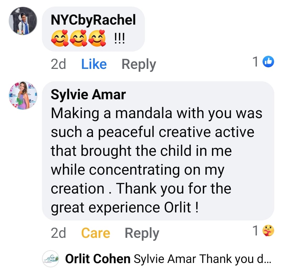 Making a mandala with you was such a peaceful creative active that brought the child in me while concentrating on my creation. Thank you for the great experience Orlit!