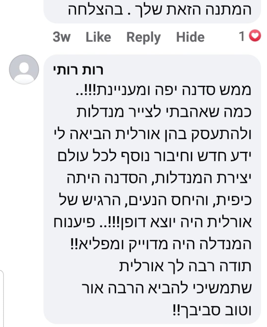 השתתפתי בסדנת מנדלות והחוויה הייתה מדהימה! אורלית הייתה מקצועית והסדנה הייתה מרגיעה ומעוררת השראה. נהניתי מהאפשרות ליצור בצורה חופשית ובאווירה נעימה. מומלץ מאוד למי שמחפש זמן של רוגע ויצירתיות.