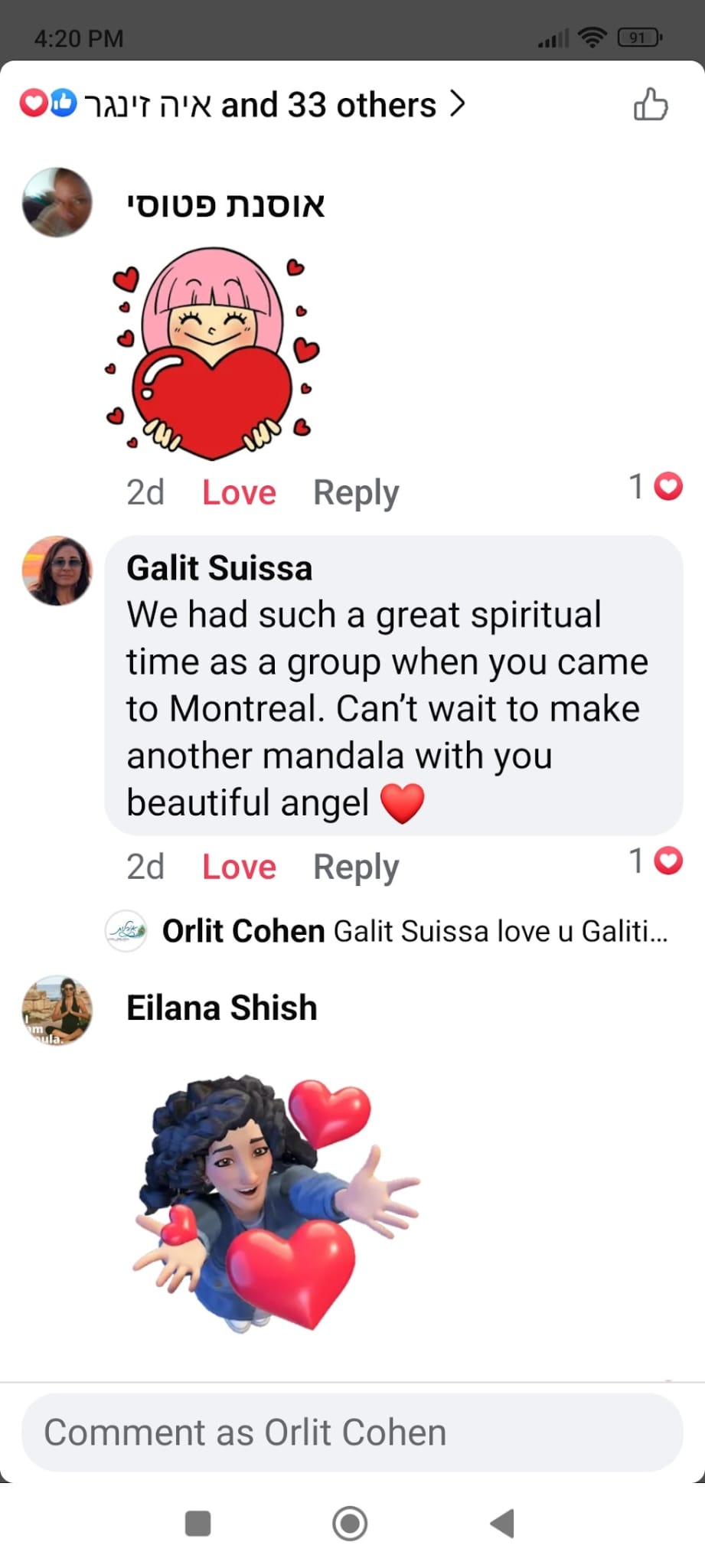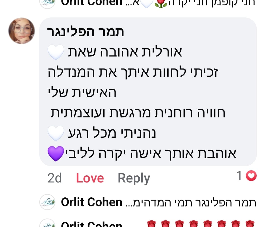 אורלית אהובה שאת זכיתי לחוות איתך את המנדלה האישית שלי חוויה רוחנית מרגשת ועוצמתית נהניתי מכל רגע אוהבת אותך אישה יקרה לליבי
